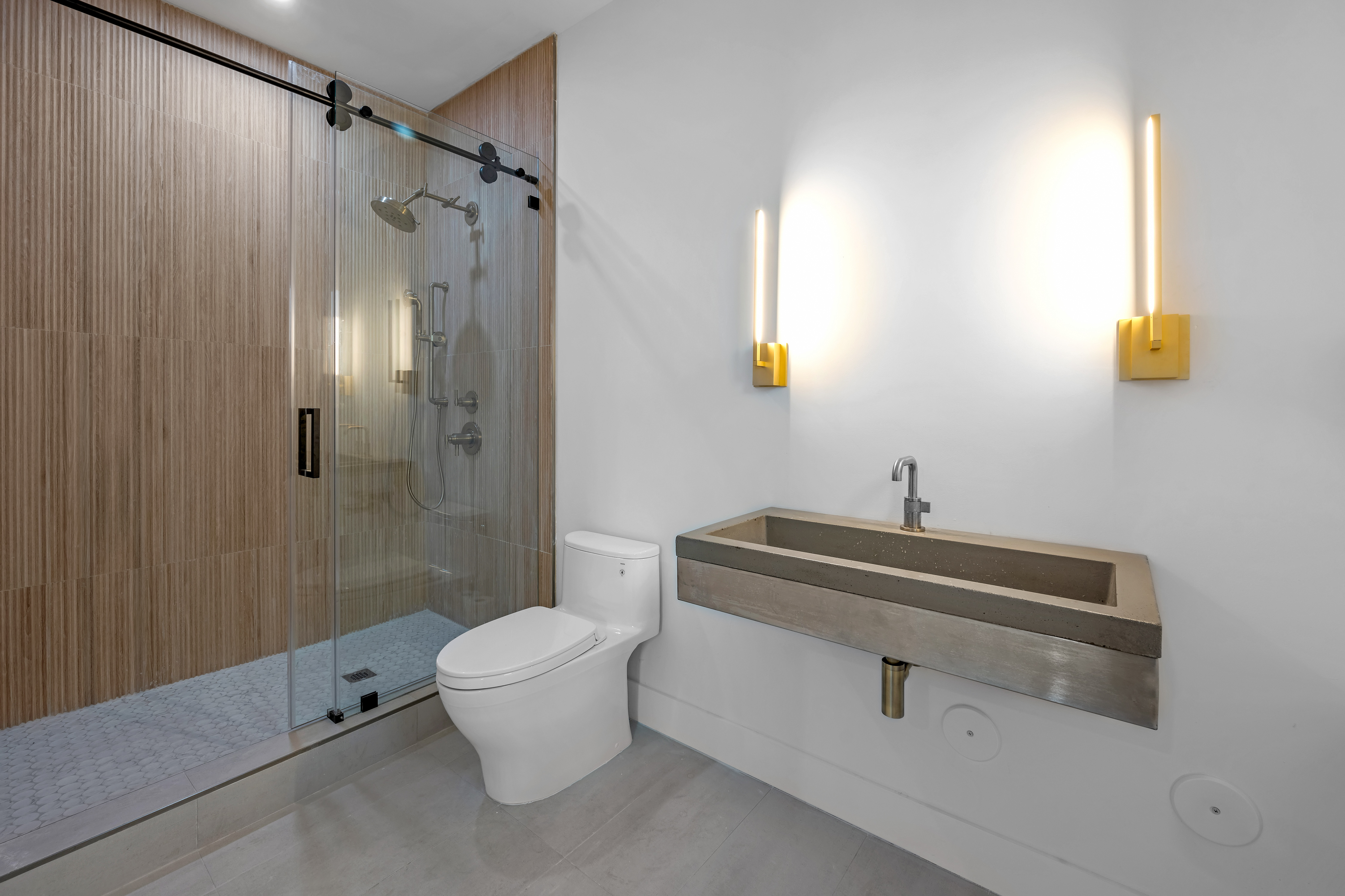 Unit A’s other baths featured a hexagonal shower floor and custom cabinet system with calacatta quartz countertops while Unit B’s featured floating, minimal vanities with textured wall tile.