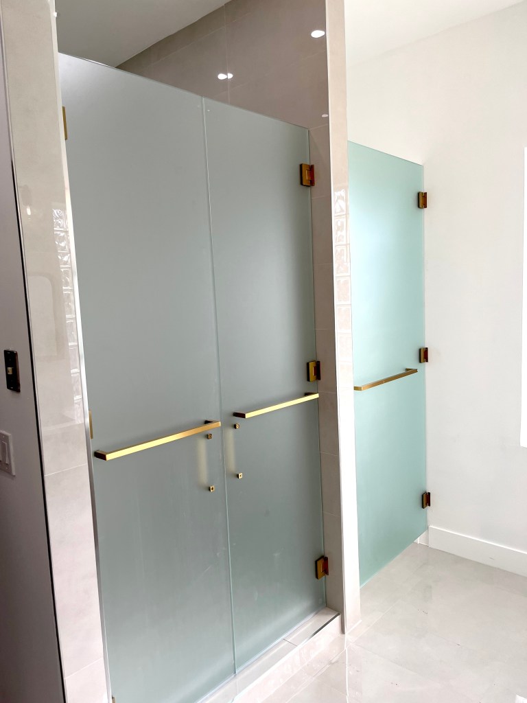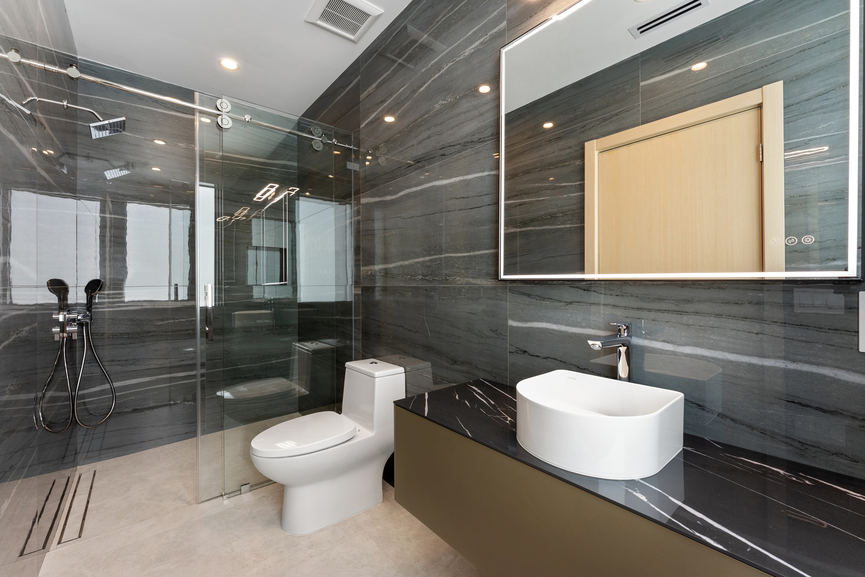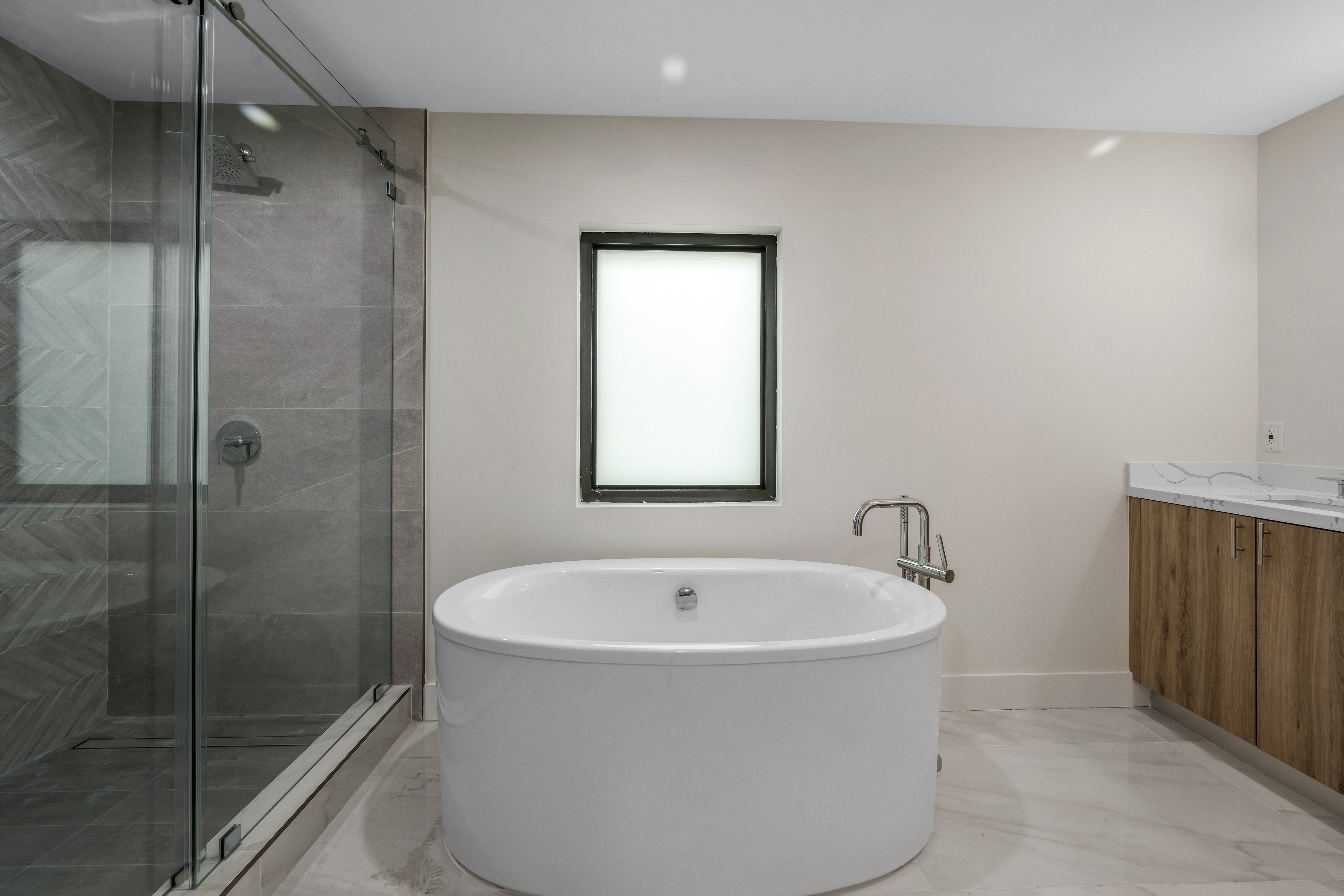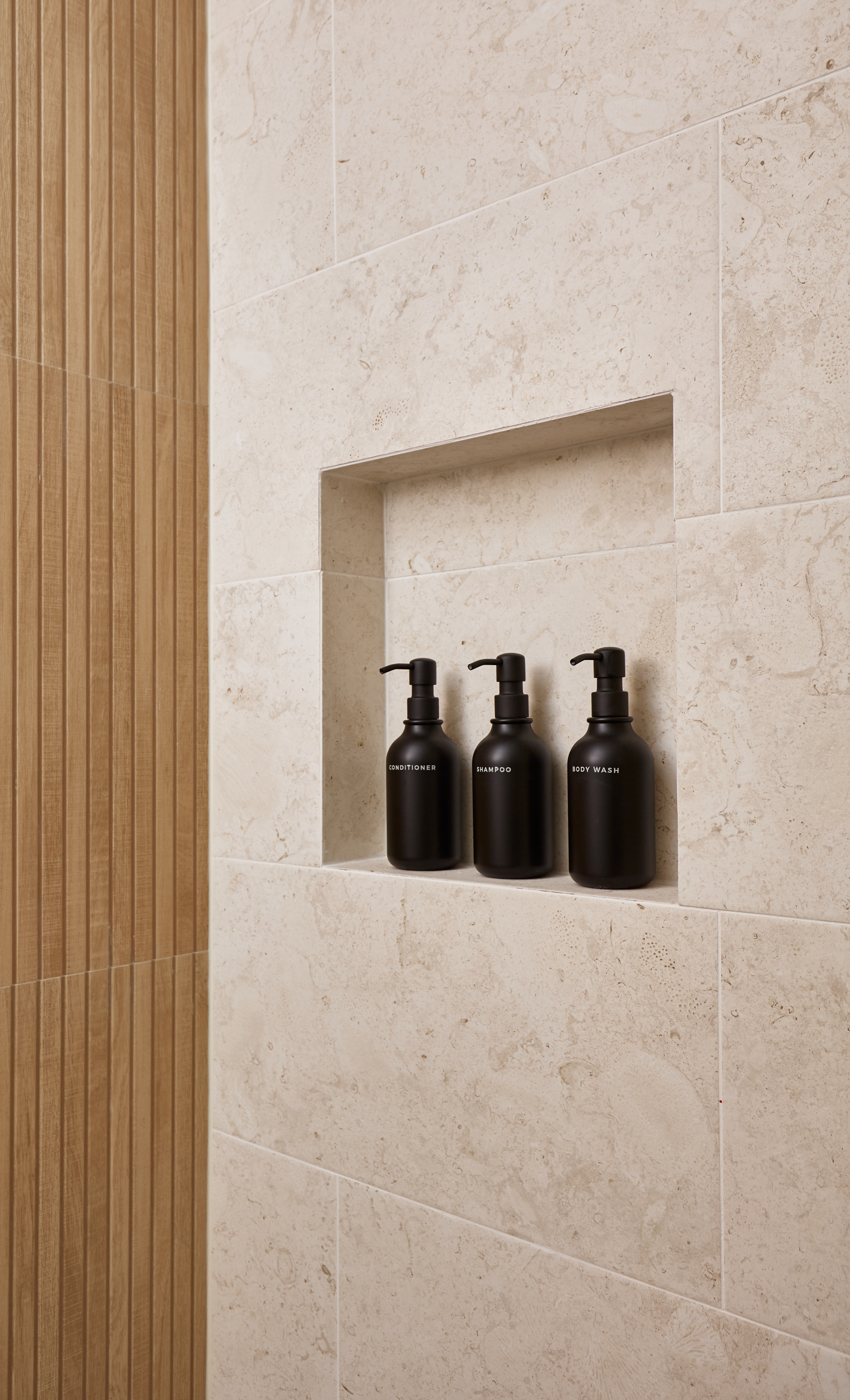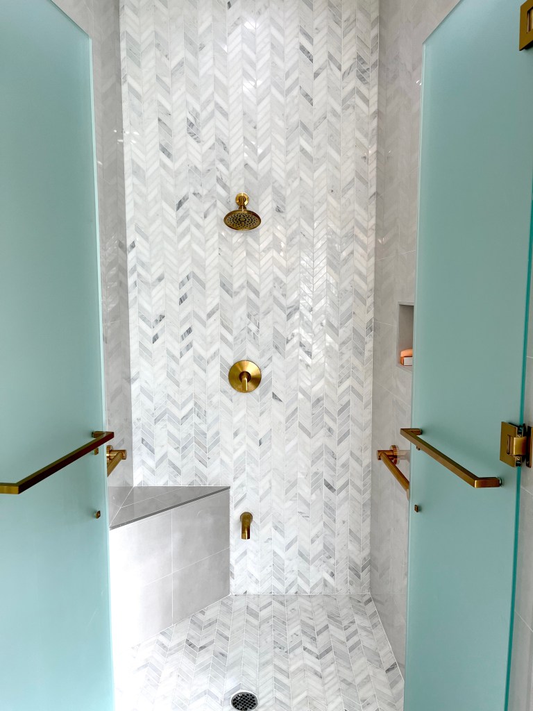 Gut renovation of a 1990s bathroom. To create more space, we removed a room that had a shower and toilet together and gave each a glass door to access the main bathroom space. The clients did not want a tub, so we created a bench with storage beneath.