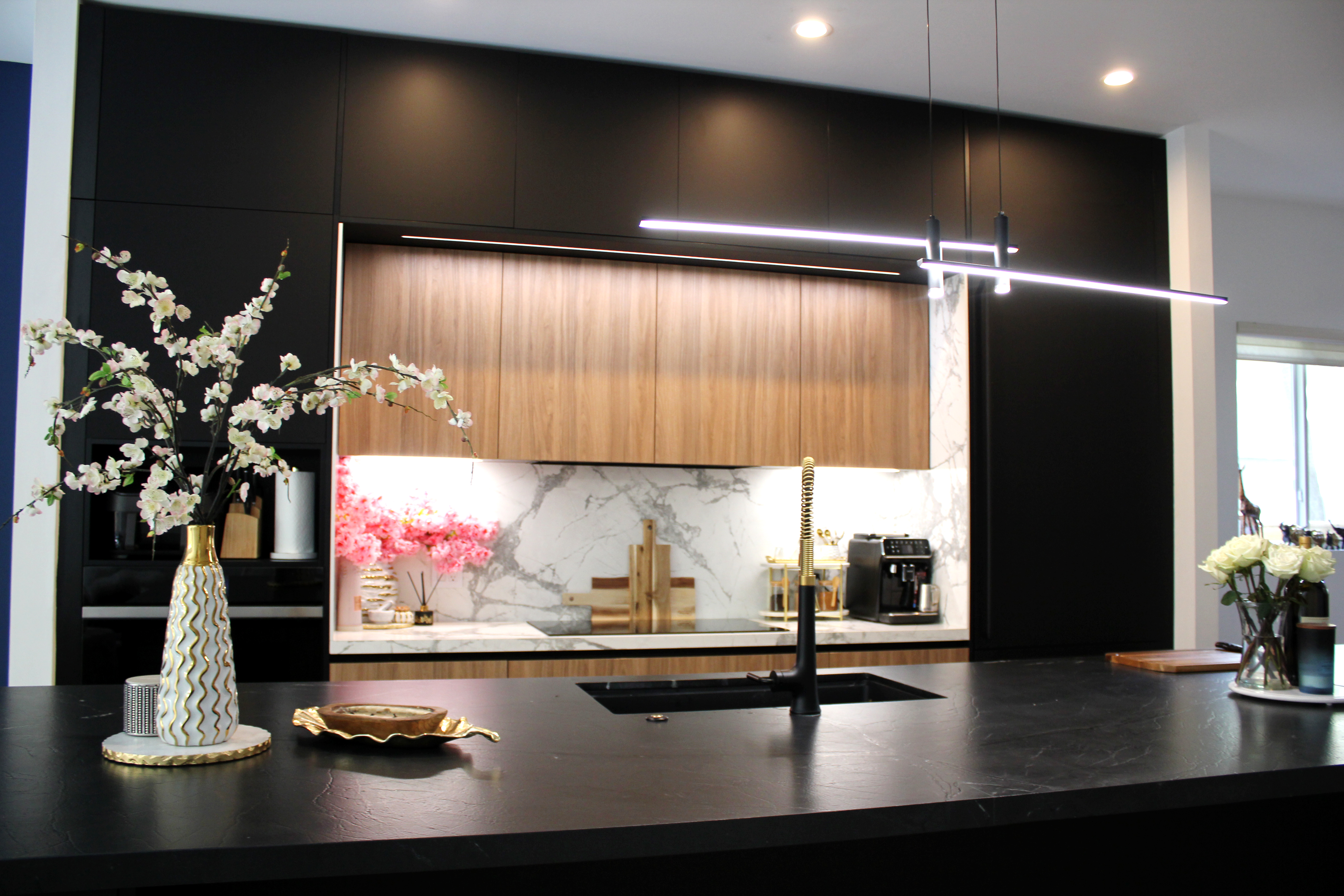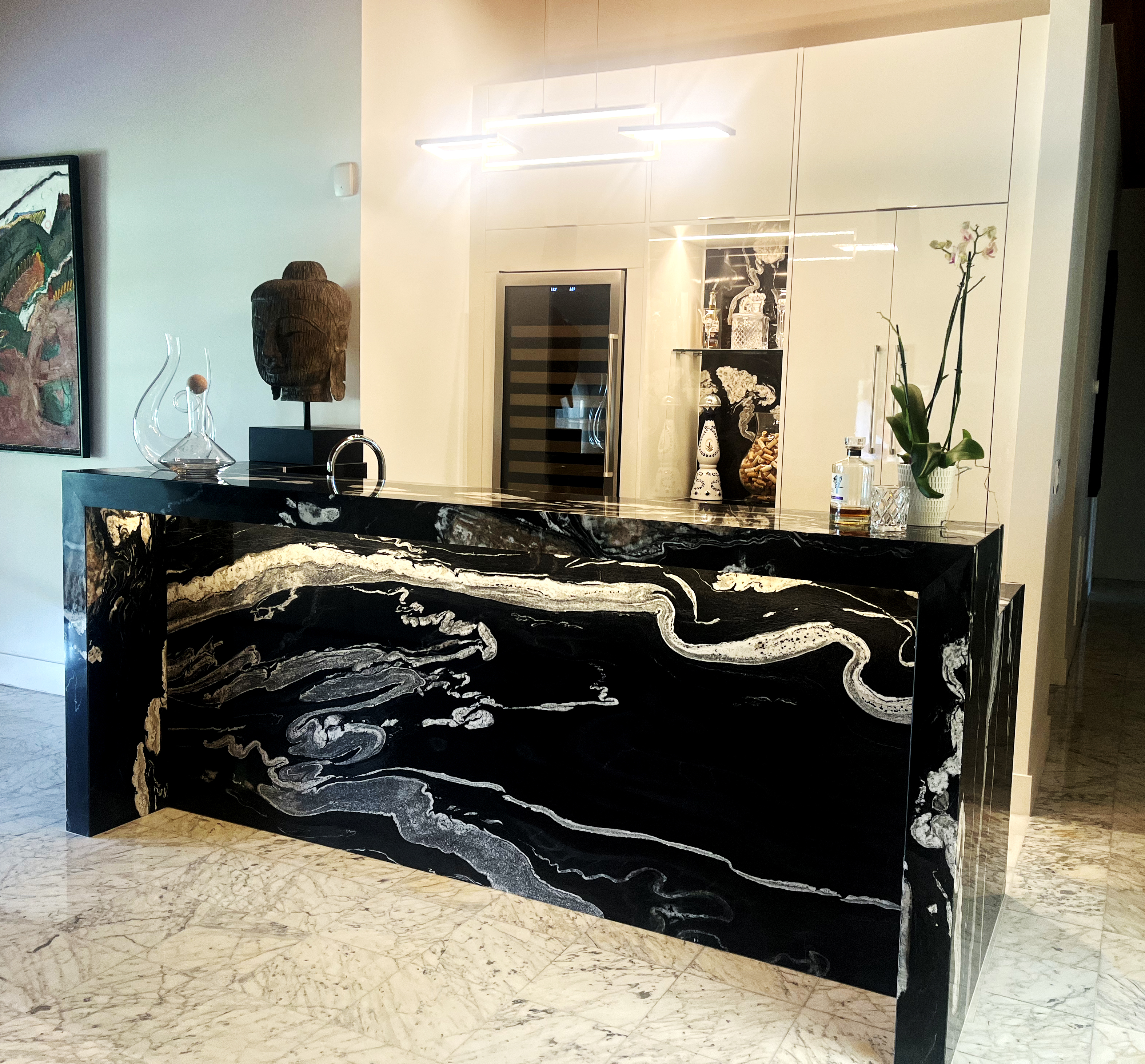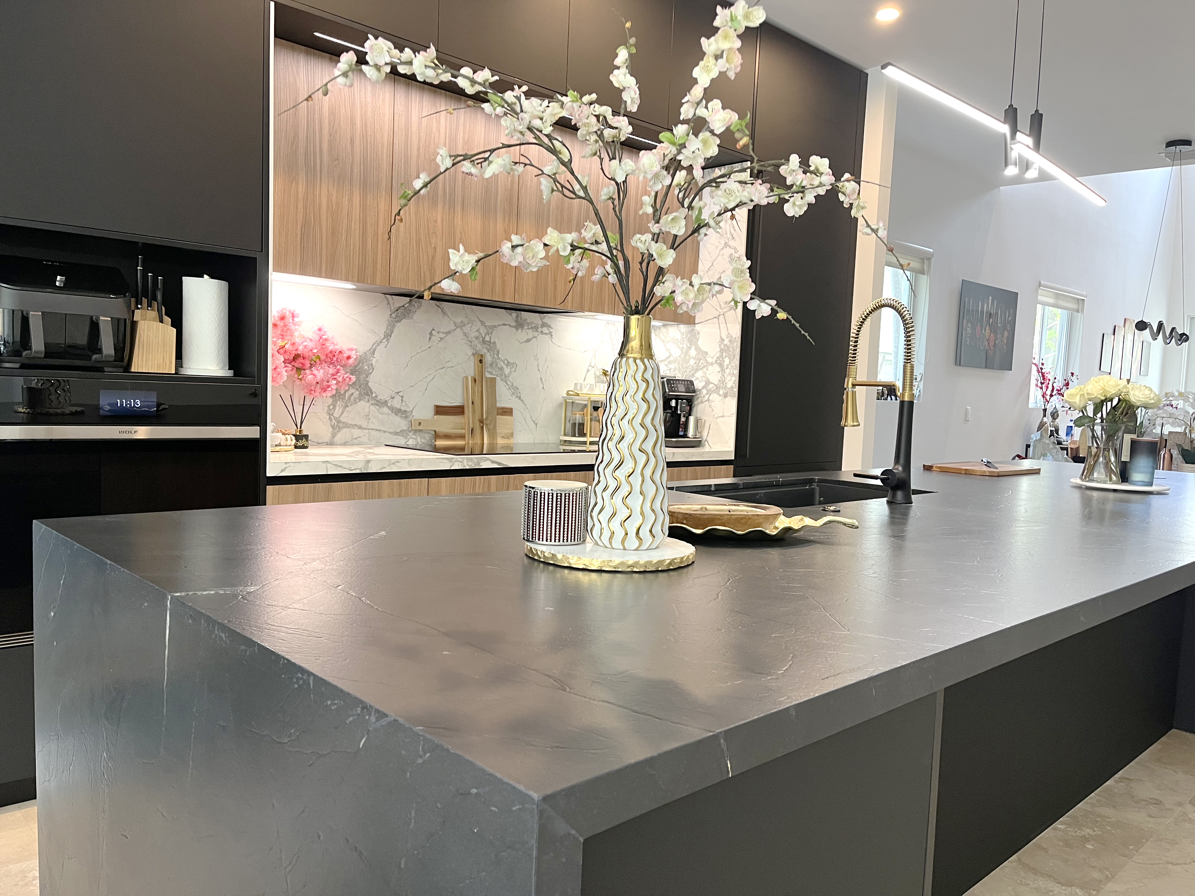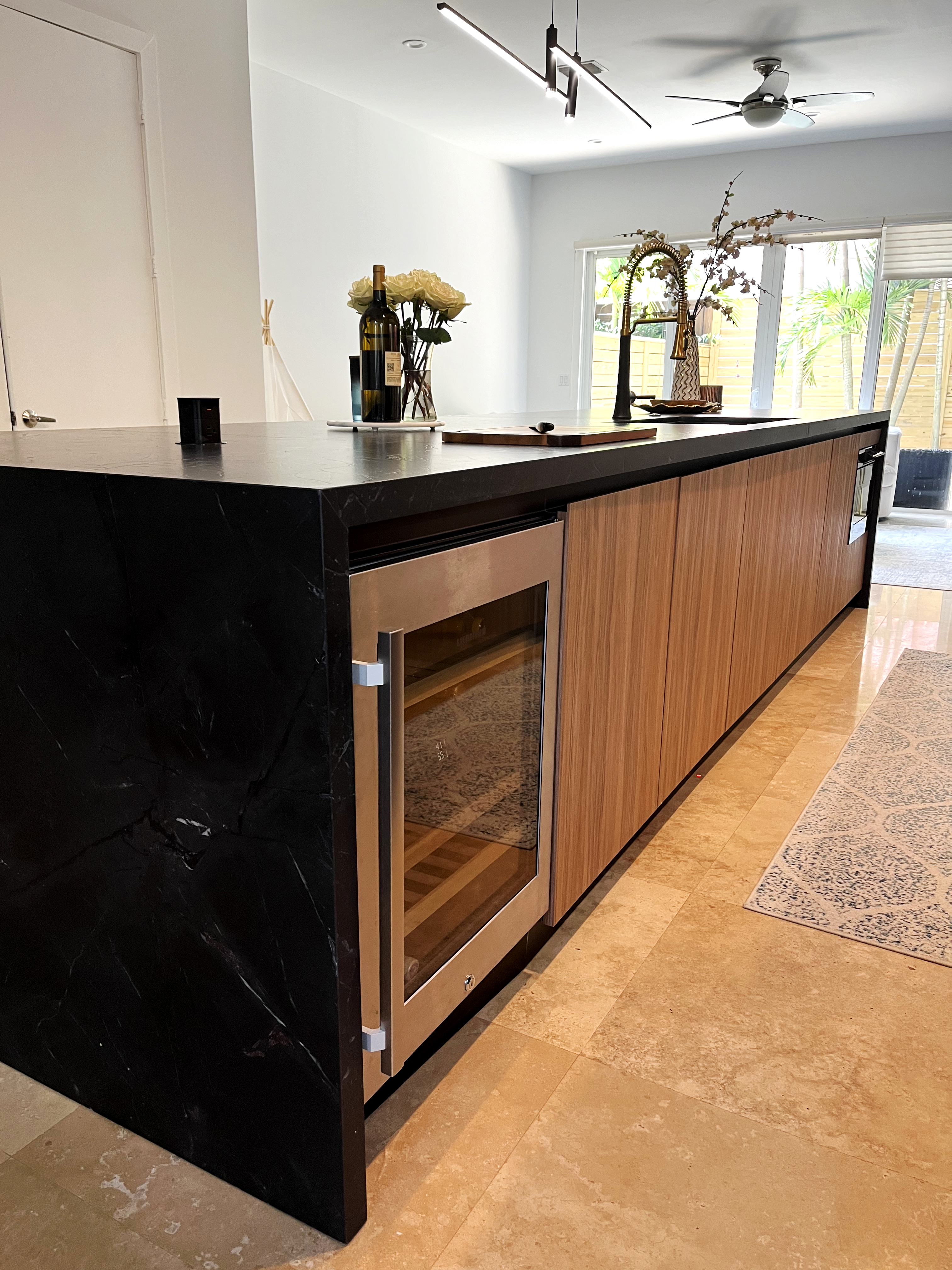 We added a house-changing all-black Italian kitchen by MiaCucina to this modern townhouse in Coconut Grove. The 14 ft island is the largest we’ve ever installed in a home, completely covered in slab-leather quartz, and the stove and backsplash are treated with matte porcelain.